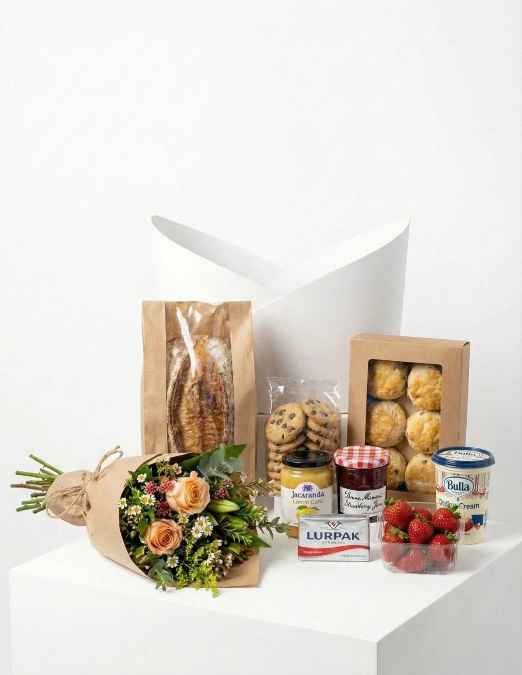The Baker’s Pantry is designed to feel like opening a well-loved kitchen cupboard — filled with buttery staples, sweet treats, fresh berries and a hand-tied floral posy to soften the moment.